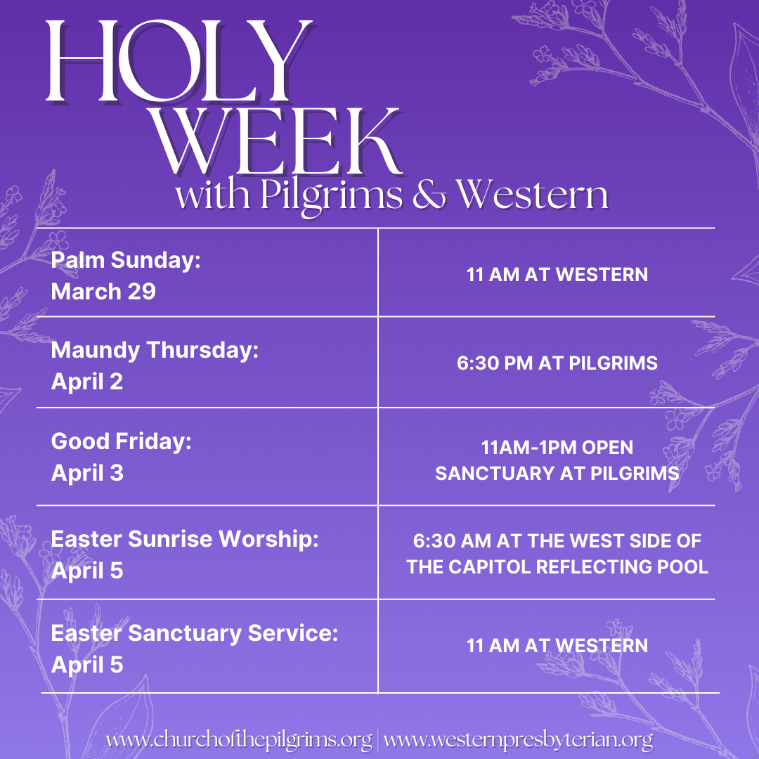We’ll begin Holy Week at Pilgrims with our 11am worship service which will be a journey from the palm procession to the passion story.